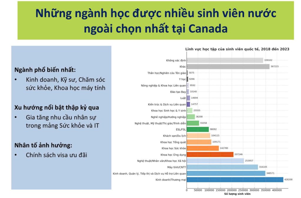 Ở Canada, xu hướng chọn ngành của du học sinh khá tương đồng với Mỹ. Những lĩnh vực nổi bật gồm Kinh doanh, Kỹ sư, Chăm sóc sức khỏe và Khoa học máy tính. Trong thập kỷ qua, Canada ghi nhận sự tăng trưởng mạnh về nhu cầu nhân lực trong ngành Y tế và Công nghệ, mở ra cơ hội việc làm bền vững cho sinh viên quốc tế.