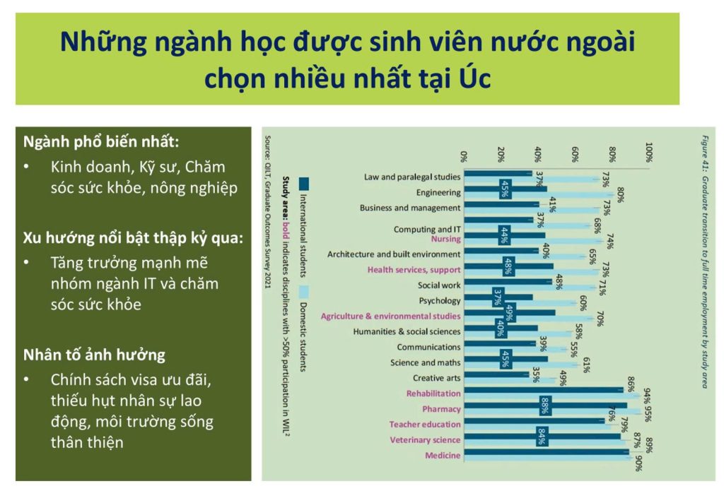 Trong khi đó, Australia ngoài những ngành phổ biến như Kinh doanh và Kỹ sư, còn nổi tiếng với các chương trình về Nông nghiệp và Lâm nghiệp nhờ điều kiện tự nhiên và môi trường học tập đặc thù.